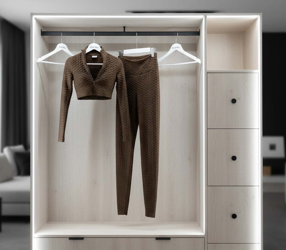 Unleash your inner strength with the Ripple Active Set. Crafted from a unique textured fabric in a rich, warm brown, this two-piece ensemble is designed for both performance and style. The zip-up crop top offers versatile coverage, while the matching leggings provide a flattering fit for all your movements. Perfect for your workout or a chic athleisure look, experience the dynamic elegance that defines Éclat Rue.